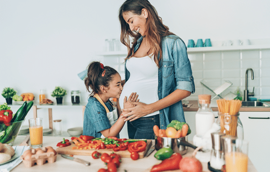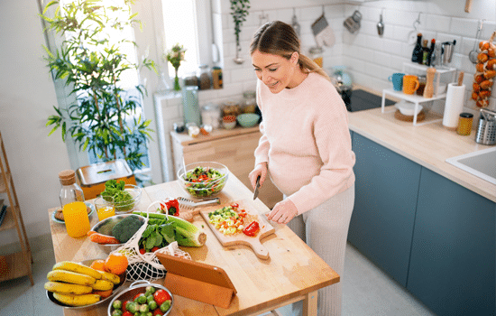Greifen Sie oft zu vollwertigen, unverarbeiteten Lebensmitteln wie Obst, Gemüse und Vollkornprodukten, um Ihren Körper mit wichtigen Nährstoffen zu versorgen und den Blutzuckerspiegel stabil zu halten. Das ist auch für Ihr Baby das Beste.