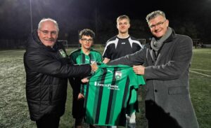 „Auf geht´s!“ Die Freude war groß, als Dr. Markus Rudolph und Michael Gilster als Geschäftsführer von InfectoPharm höchstpersönlich dem C-Jugendteam des FC Starkenburgia Heppenheim einen neuen Trikotsatz überreichten.